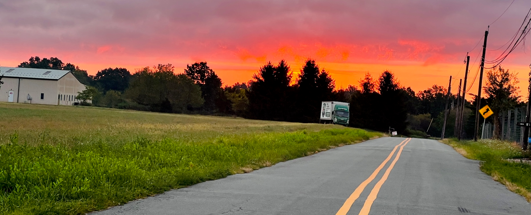 - 1 Ramesh Kumar- Sunrise over Harbat Farm on Yard Road- red sunset in background, truck coming