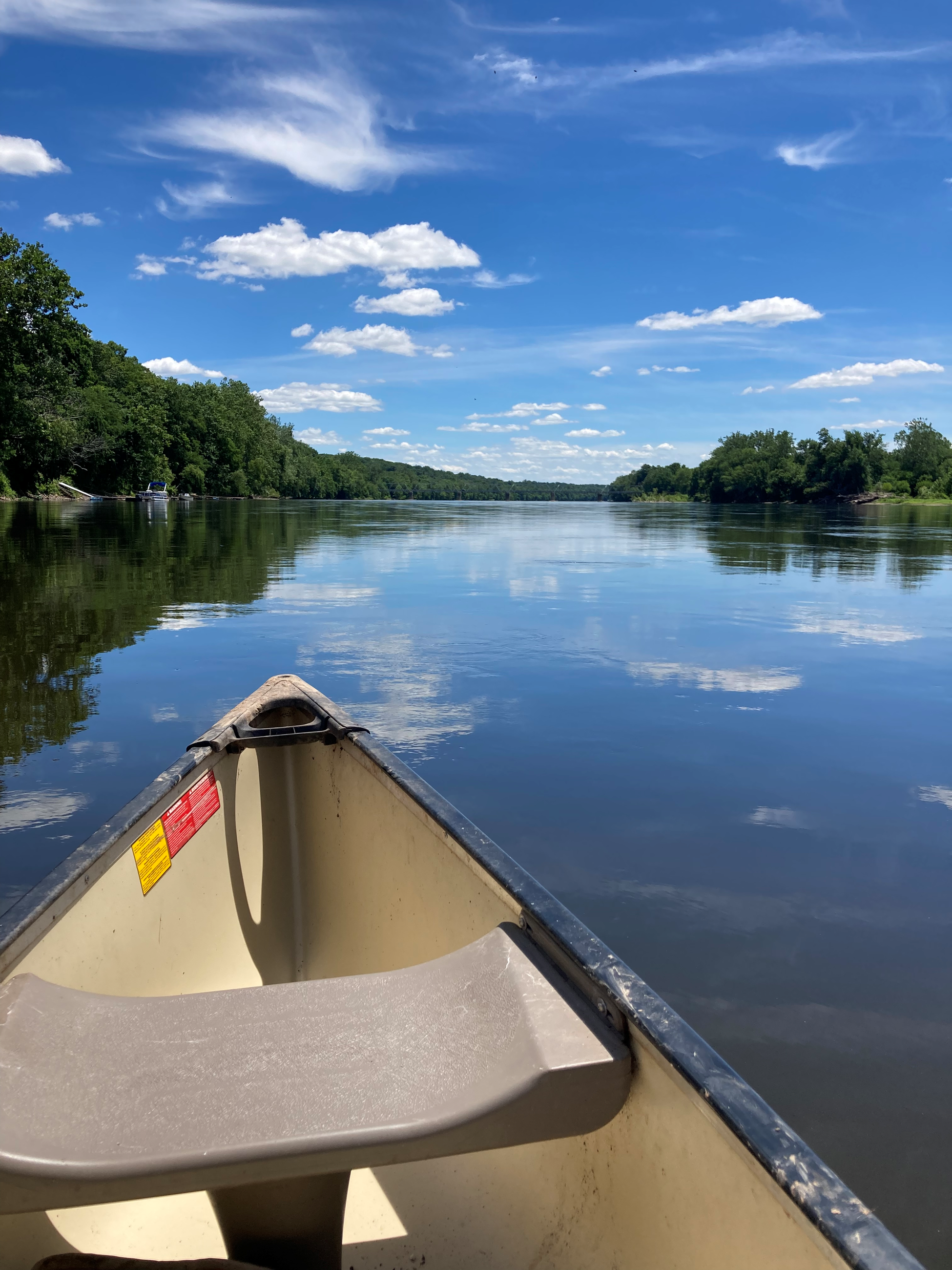 - 13 Gabrielle M. Casieri- Canoeing on the Delaware- front of canoe on river with clear sky, sun, clouds