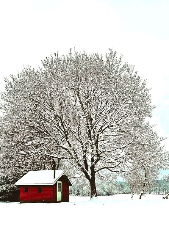- 6 David VanSelous-large tree behind a pump house with lots of snow on roof, branches and ground