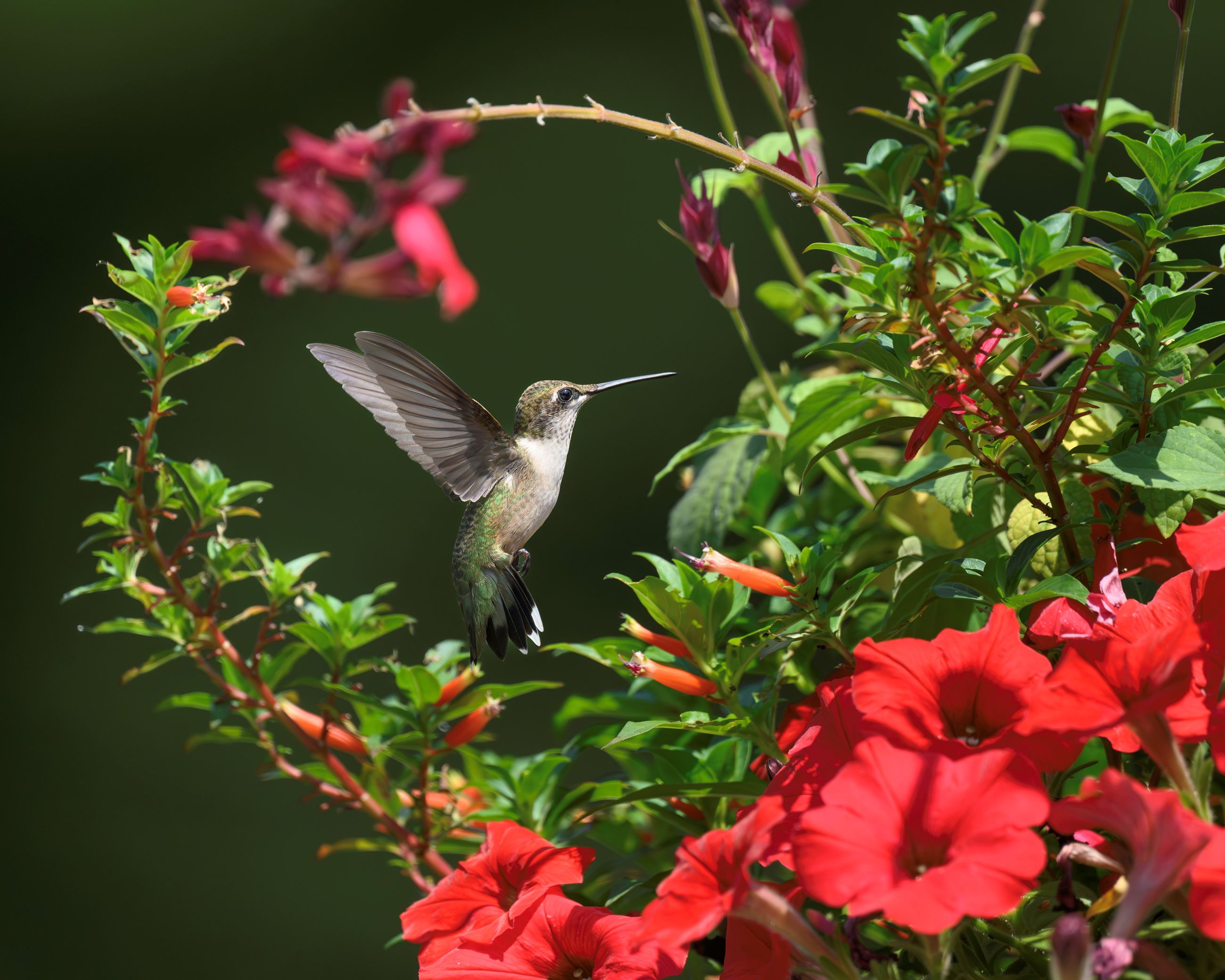 - 7 Rebecca DePorte- closeup of a hummingbird hovering near a basket of flowers