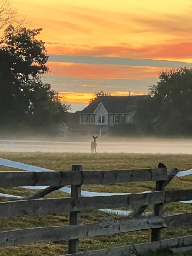 - 14 Sari DeCesare- Deer In The Morning Mist in a field behind a fence and in front of a house