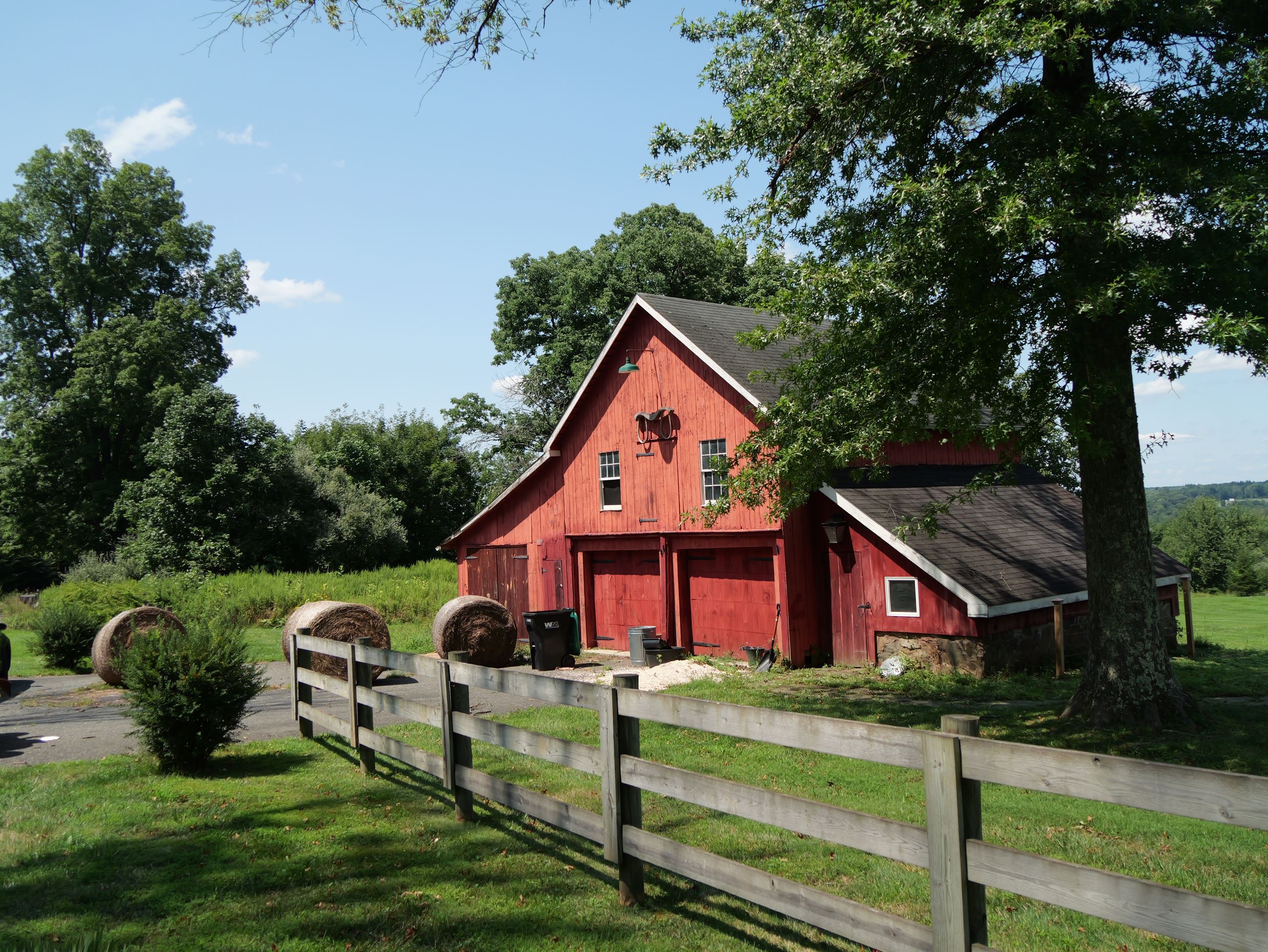 - 16 Stacey Gennace- Barn on a sunny day with a fence and hay bales in front