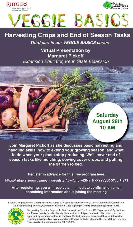 Margaret Pickoff, Extension Educator, Penn State Extension, will discuss basic harvesting and handling skills, how to extend your growing season and what to do when your plants stop producing. She’ll cover end-of-season tasks like mulching, sowing cover crops, and putting the garden to bed. Registration is limited to the first 500 participants. Those who register will receive an email with access to the recorded presentation after it has occurred.