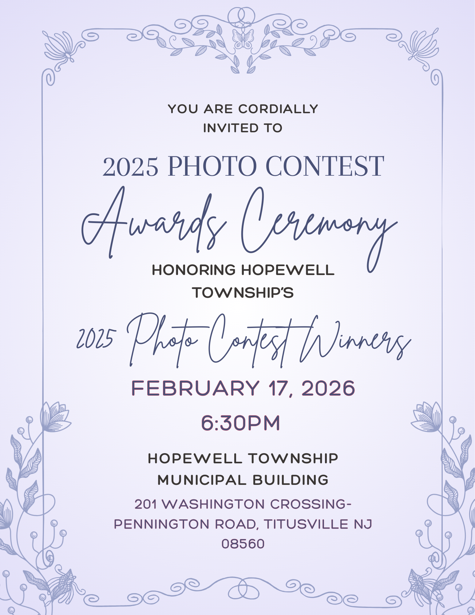 Hopewell Township, Mercer County, NJ - You're invited! ✉️ Hopewell Township will recognize the winners of the 2025 Photo Contest at the February 17, 2026 Township Committee Meeting. Winners will be honored with a proclamation, and the printed photographs will be unveiled for public display.