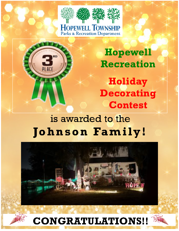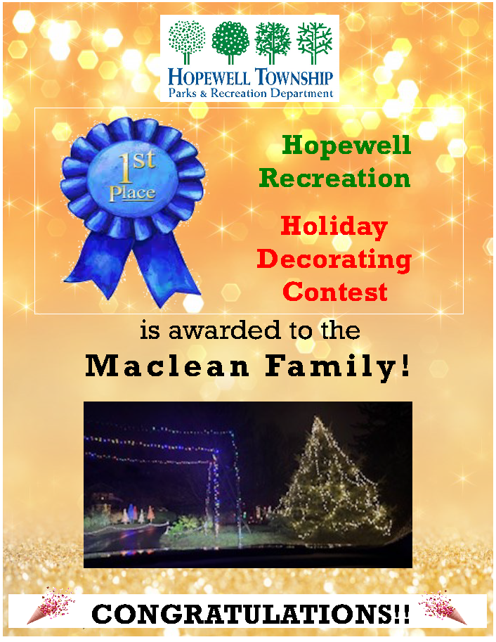 First, we would like to thank all of our wonderful Hopewell Township residents that participated this year!! We had an incredible time touring the neighborhoods and seeing all the wonderful decorations, lights, blow ups, and other holiday splendor!! It was an amazing way to get into the SPIRIT OF THE SEASON!!