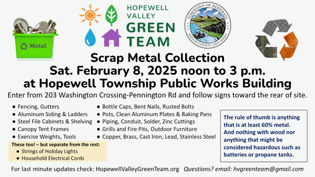 The Hopewell Valley Green Team is hosting Scrap Metal Collection on Saturday, February 8, from noon to 3:00 p.m. at the Hopewell Township Public Works building. No appointment is necessary. Questions? Email hvgreenteam@gmail.com.